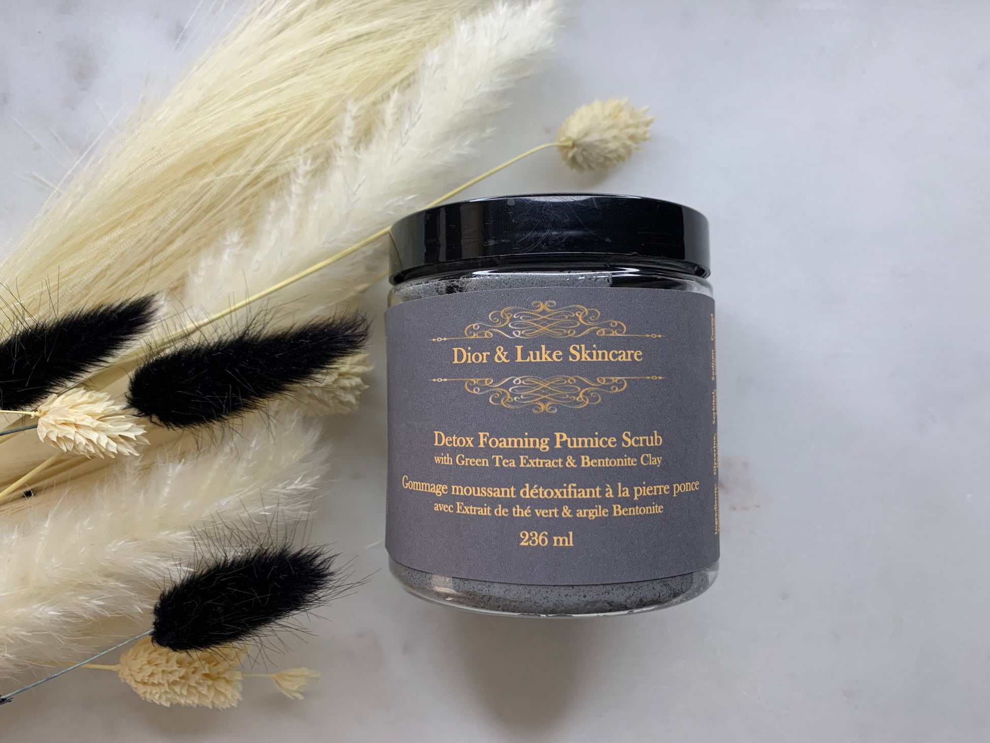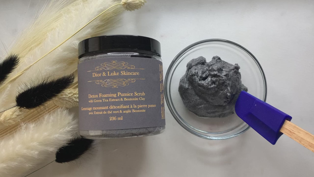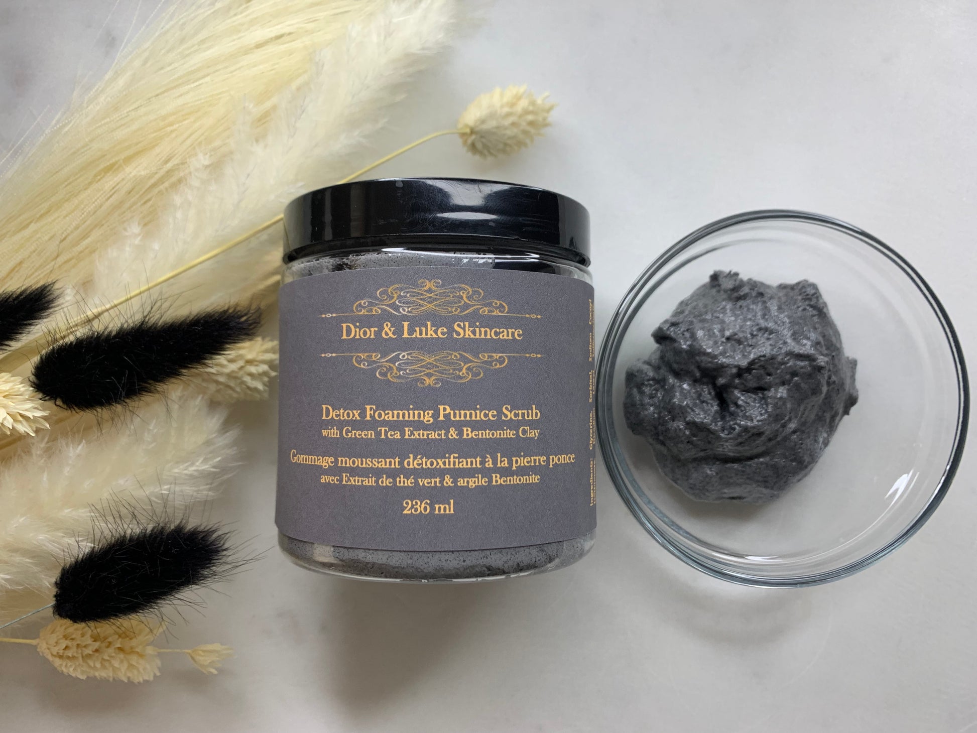 Detoxify and exfoliate your skin with our Foaming Pumice Scrub made with Green Tea Extract and Bentonite Clay.